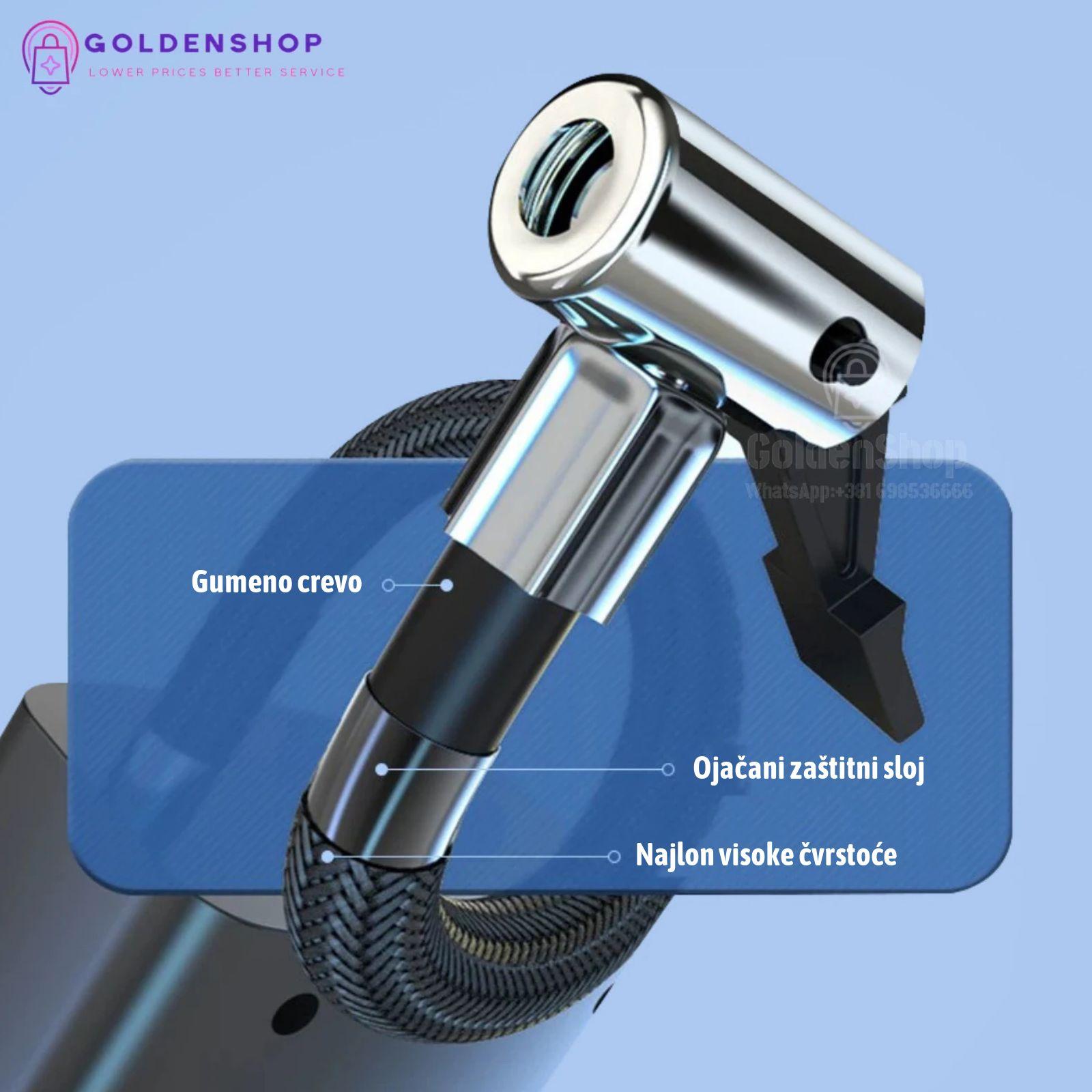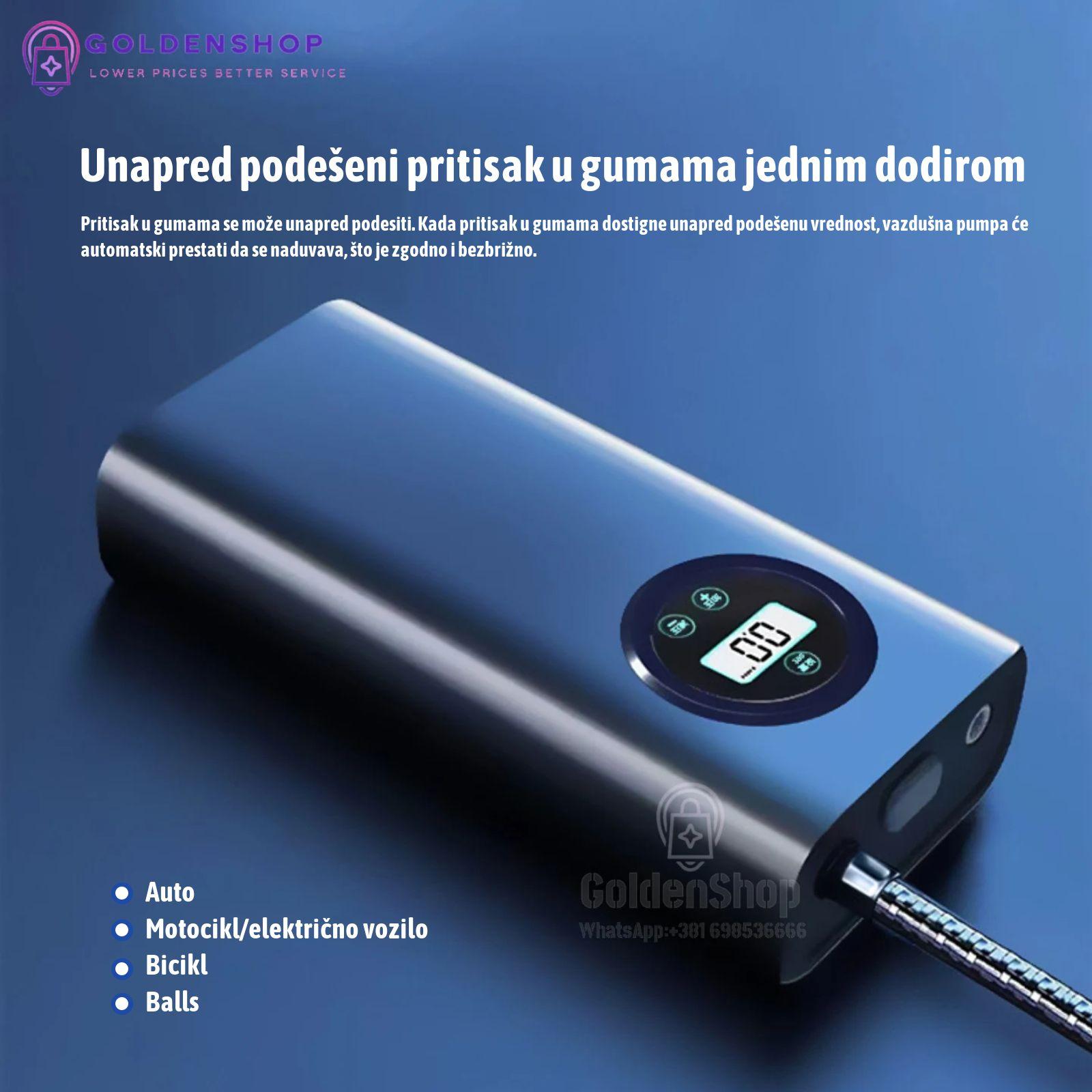Ova vazdušna pumpa za gume za bicikle i automobile dolazi sa snažnom punjivom baterijom koja se može koristiti kao pover bank za Android i IOS uređaje. Sa praktičnim Tipe-C i vremenom punjenja od samo 2,5 sata, ovaj vazdušni kompresor takođe pruža prilagođeni nosač za bicikl.