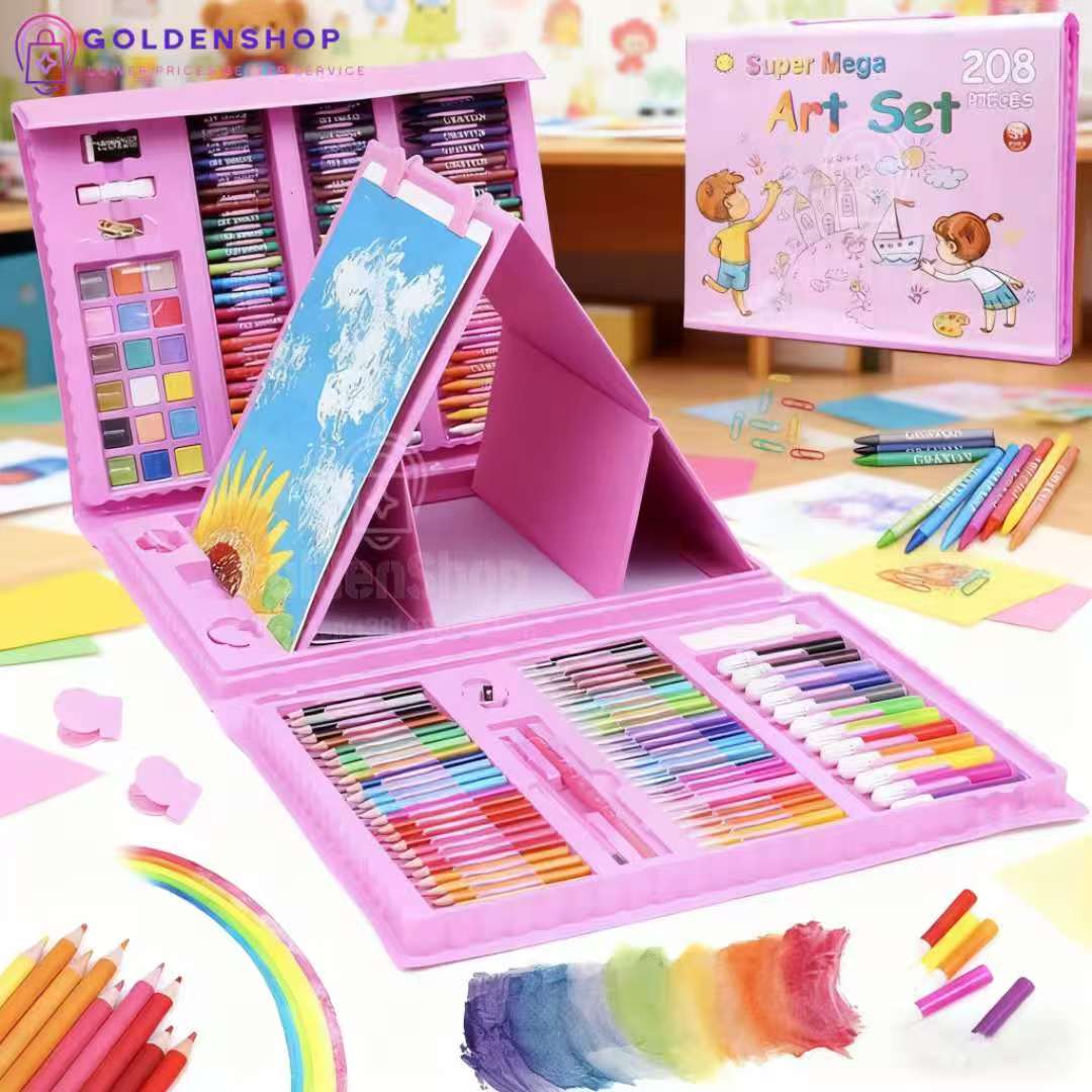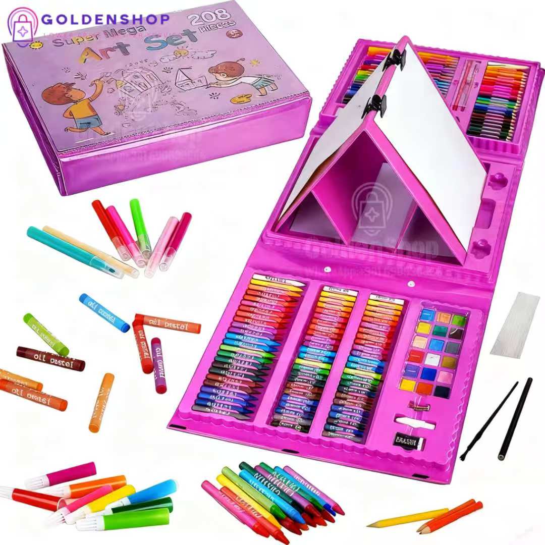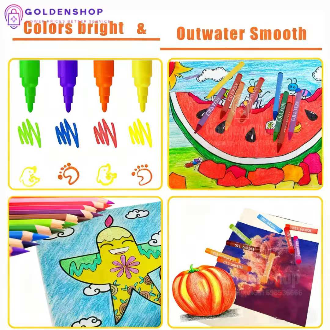 Uz pomoć ogromnog izbora bojica, flomastera, uljanih bojica, voštanih bojica, akvarel boja, rezača, lepks, korektora, gumica, A4 listova, lako ćemo kreirati najsofisticiranije, kreativne i originalne radove. Savršen umetnički set za decu i početnike.