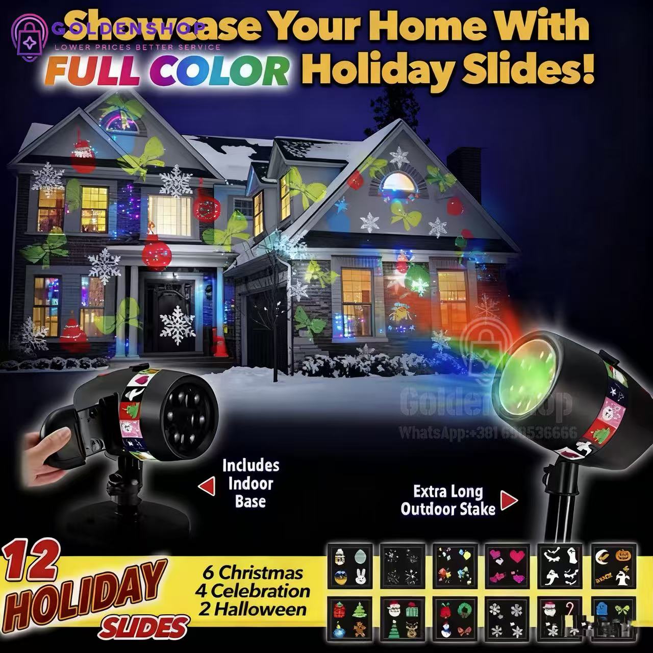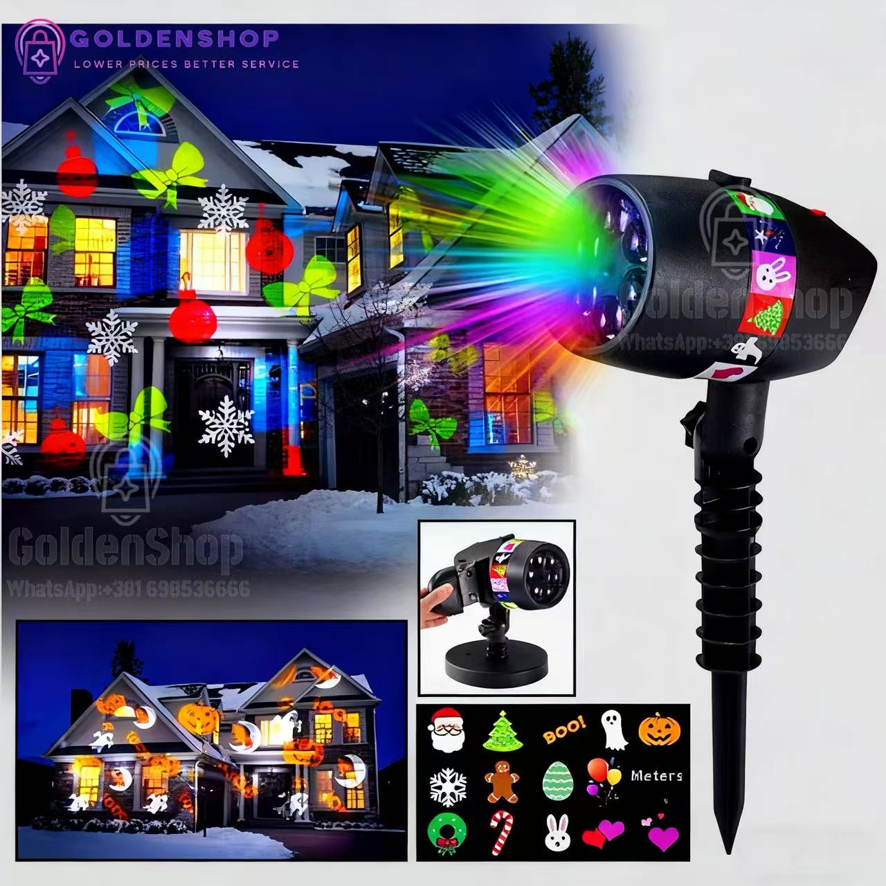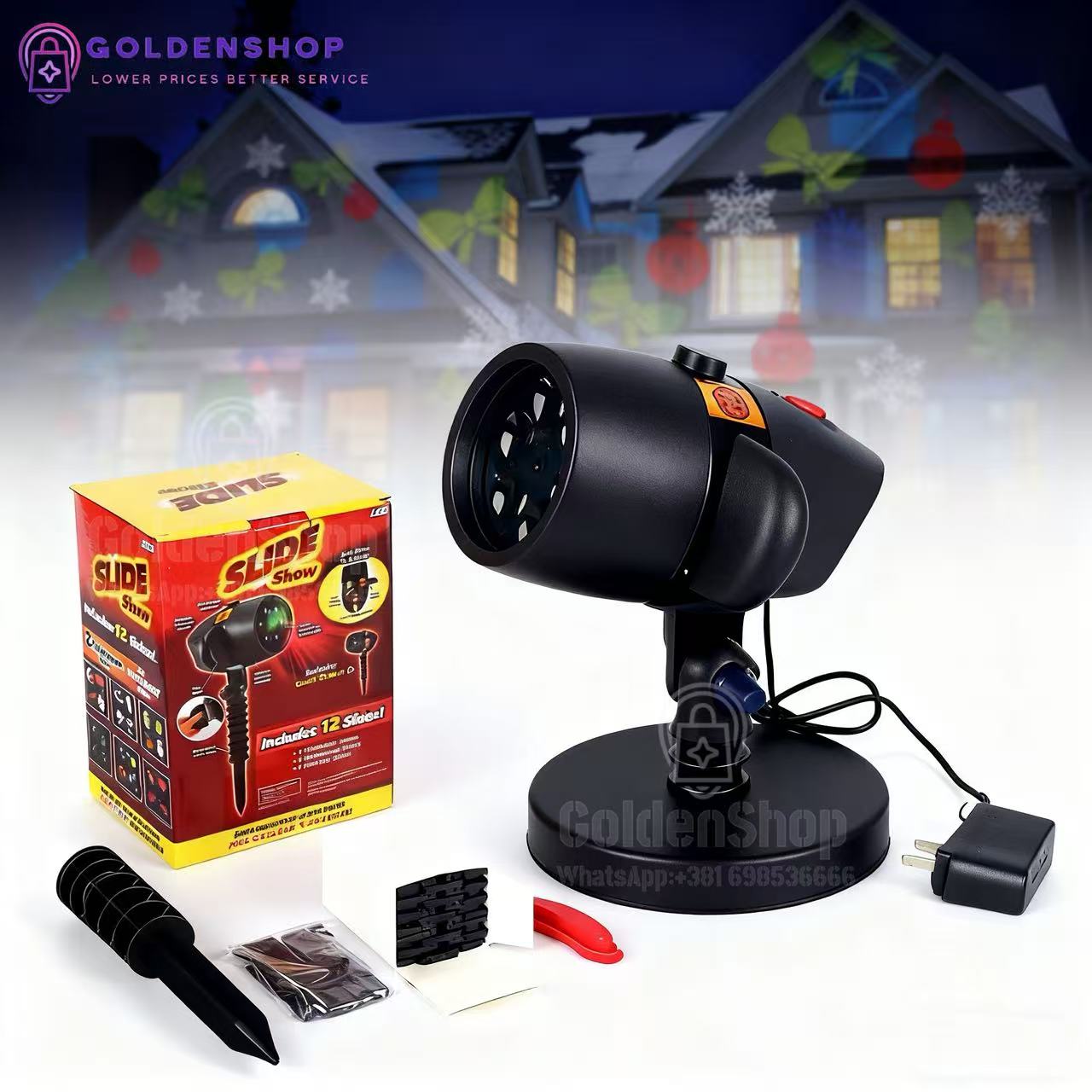 Set sadrzi 12 slajdova sa razlicitim motivima. Jednostavno, odaberite zeljene motive, adapter laserskog projektora priključite u struju i sočivo lasera koje se okreće projektovaće animacije u boji koje ce pretvoriti vašu kuću, stan ili drvo u pravu senzaciju.