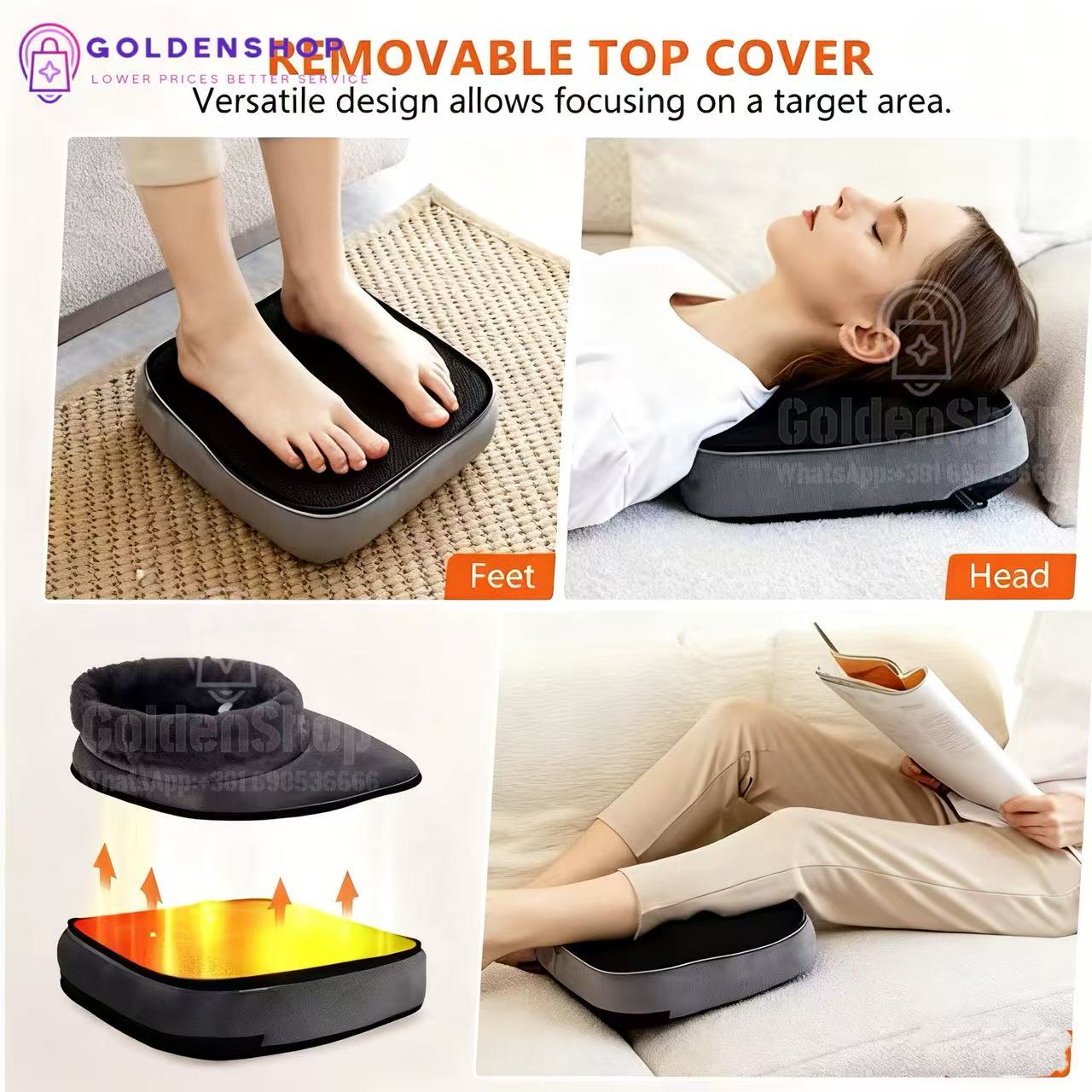 Uklonite džepić za stopala sa masažera i pretvorite ga u masažni jastuk za vaša leđa, stomak, grudi ili bilo koji drugi deo tela koji želite da zagrejete ili izmasirate. Odaberite između 2 različita intenziteta opuštajuće masaže i opustite mišiće vrata, leđa ili nogu.