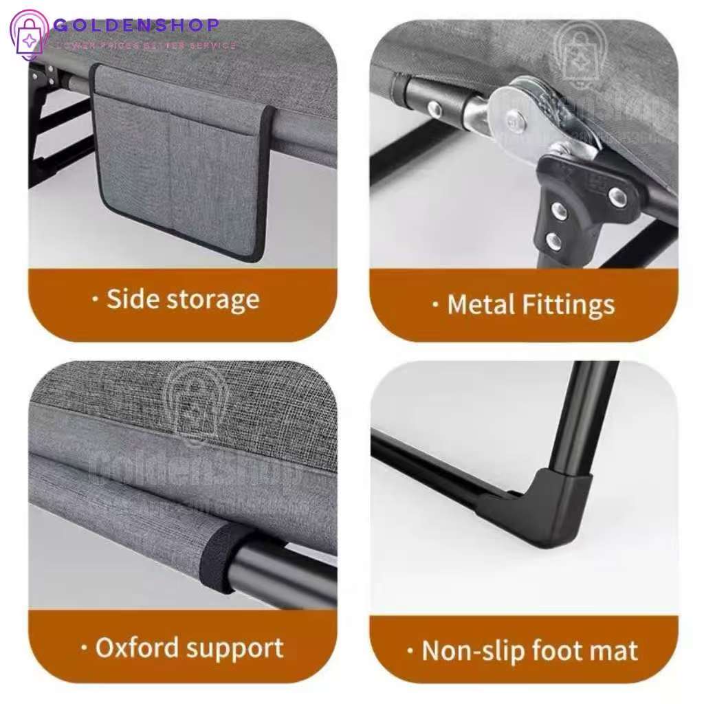 Sklopivi krevet za odmor je napravljen od izdržljive pamučne i lanene tkanine prijatne za kožu i čvrste elipsaste cevi koja može trajati dugo vremena. Protivklizni nogari koji osiguravaju stabilnost. Maksimalno opterećenje je 160kg